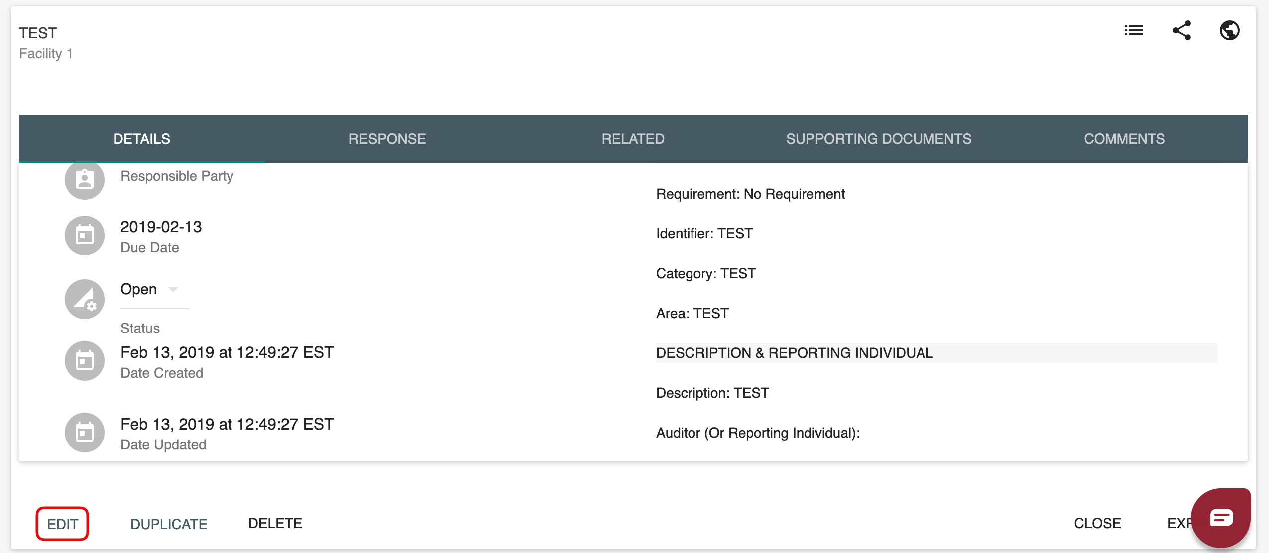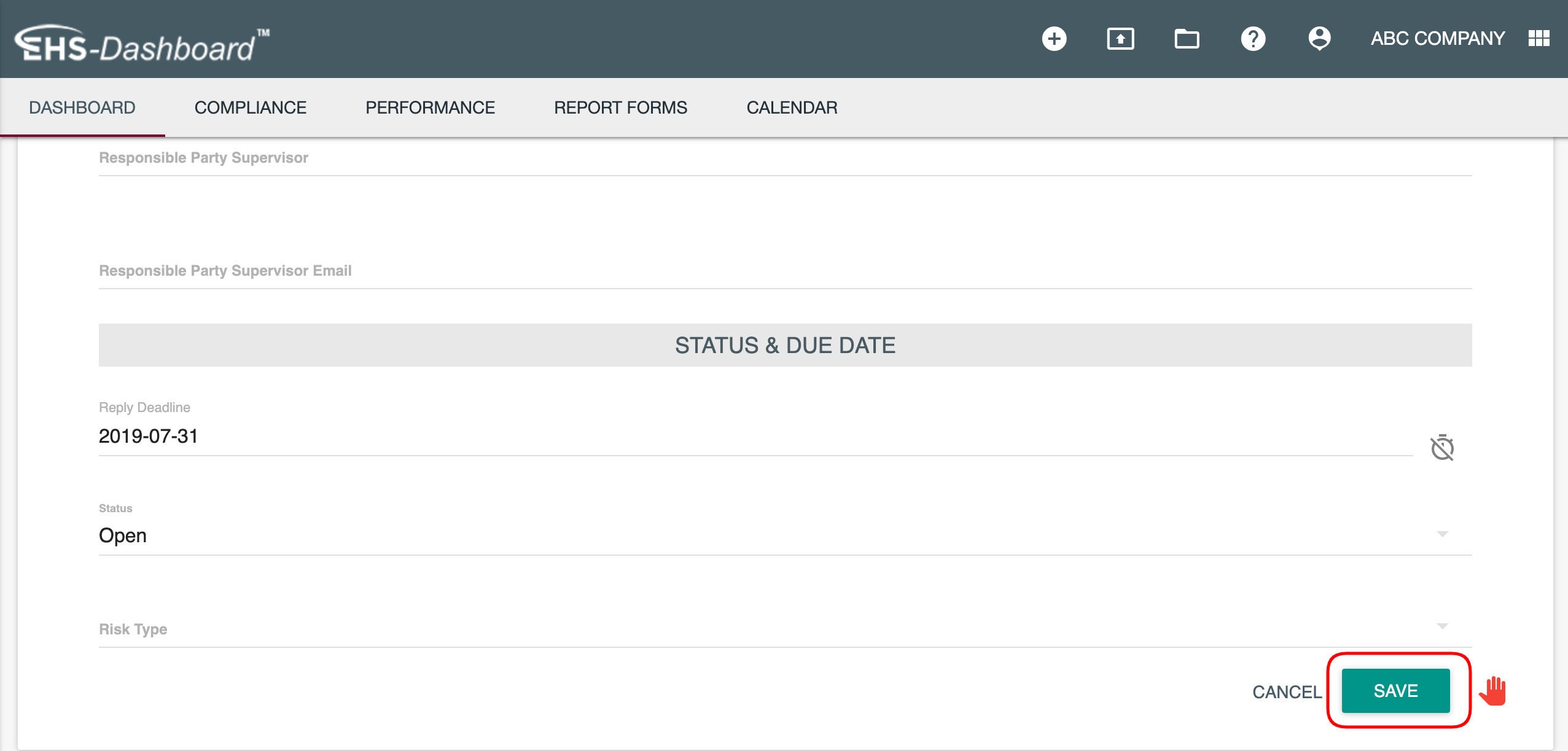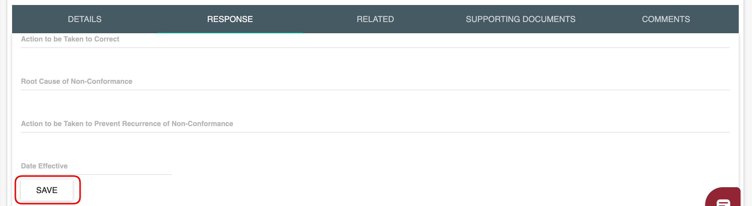 2.) When a Corrective Action is complete, update the status field to closed. Edit the form as necessary and make sure to Click the "Save" bottom in the bottom right corner of the form before exiting.