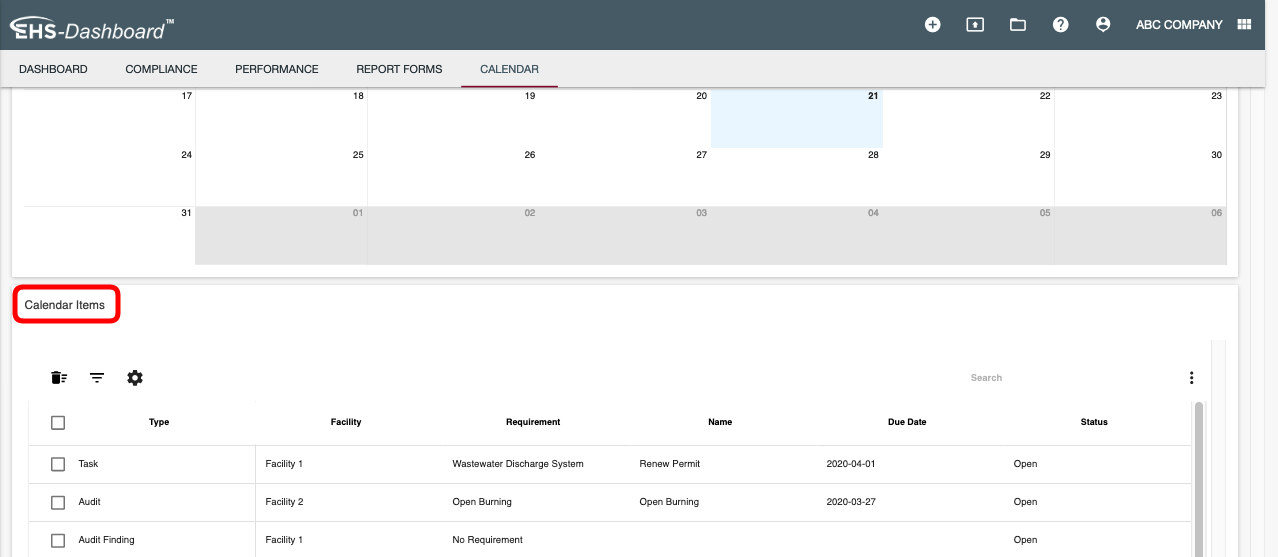 2.) Scroll past your calendar until you see the "Calendar Items" section shown below: