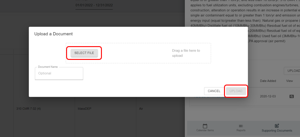 Documenting backup information for your compliance requirements is a simple and effective way to demonstrate that you are either meeting regulatory obligations or exempt from certain requirements. In the EHS-Dashboard, you can upload supporting materials—such as PDFs, spreadsheets, Word documents, or photographs—to help substantiate your compliance activities and maintain clear records.
